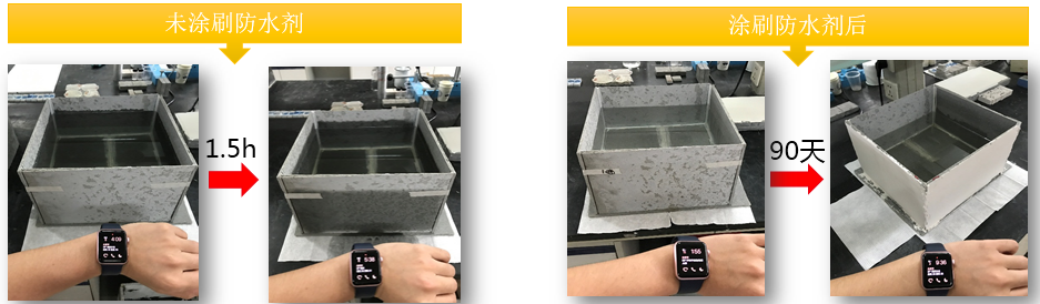通過對比試驗可以看出,表面涂刷防水劑的水槽,在長達90天的觀察實驗后,依舊保持表面干燥。而未涂刷防水劑的水槽,則在一個半小時之后,就被完全滲透。