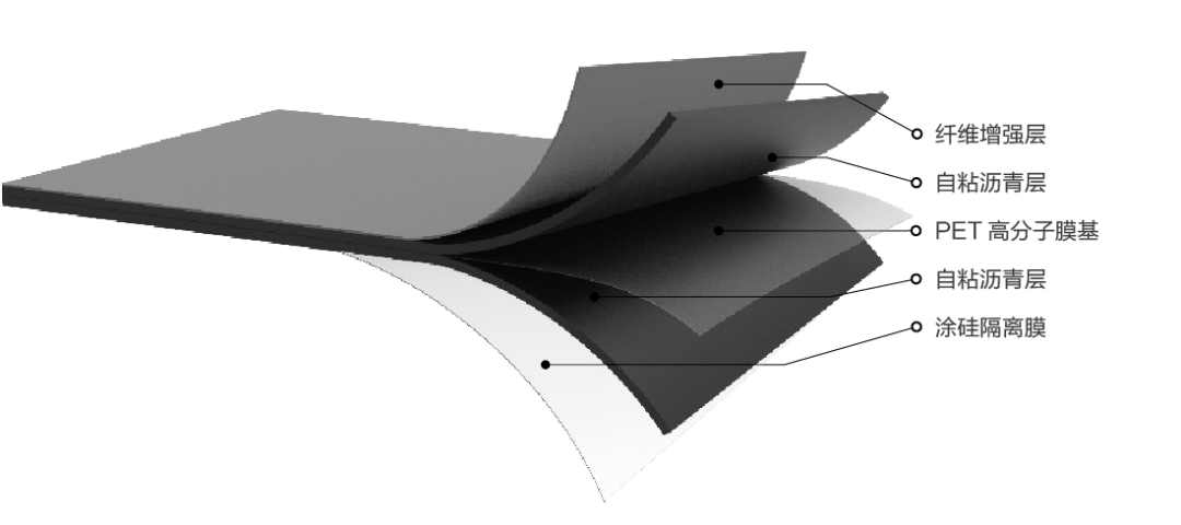 SAM-924纖維增強(qiáng)型高分子膜基自粘瀝青防水卷材執(zhí)行GB/T35467-2017《濕鋪防水卷材》中的高分子膜基類。卷材以自粘瀝青為粘接密封層,第一增強(qiáng)層采用增強(qiáng)纖維,第二增強(qiáng)層為高分子膜基,下表面覆隔離膜。