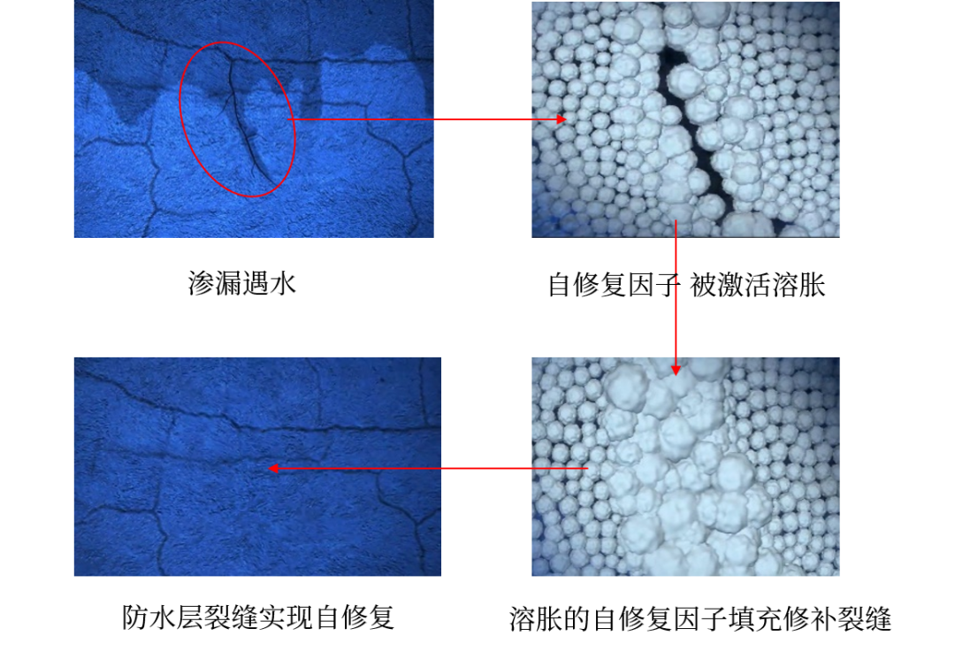 當(dāng)防水涂膜出現(xiàn)微小裂紋或損傷后,涂料中自修復(fù)因子遇水激活,膨脹成凝膠狀,并在水化作用下,形成堅(jiān)硬的化合物填補(bǔ)裂縫,有效防止反復(fù)滲漏,降低維修成本。